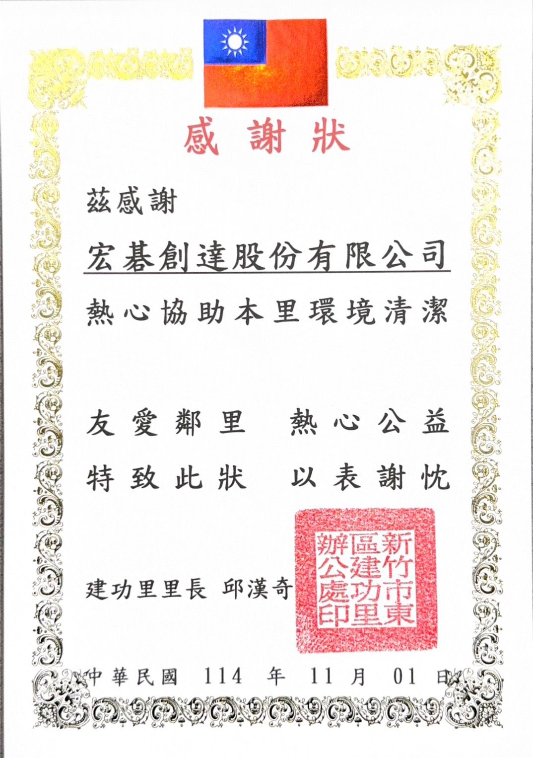 於113年度,本公司號召企業志工前進新竹市建功里,辦理社區清潔活動,以實際行動改善環境品質,促進地方永續發展。
