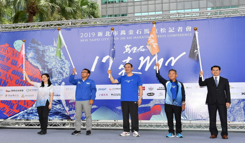 2018萬金石馬拉松開跑記者會在新北市政府舉行,副市長侯友宜(右)宣布報名訊息,並說明首度推出「萬金石馬拉松APP線上報名」。
